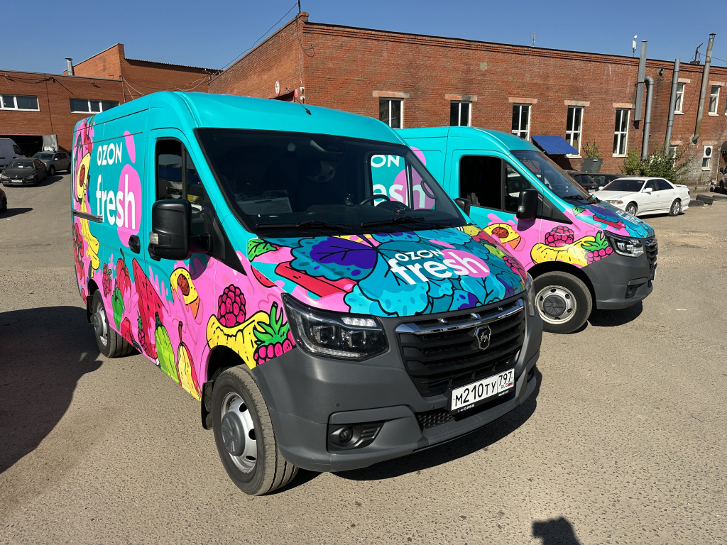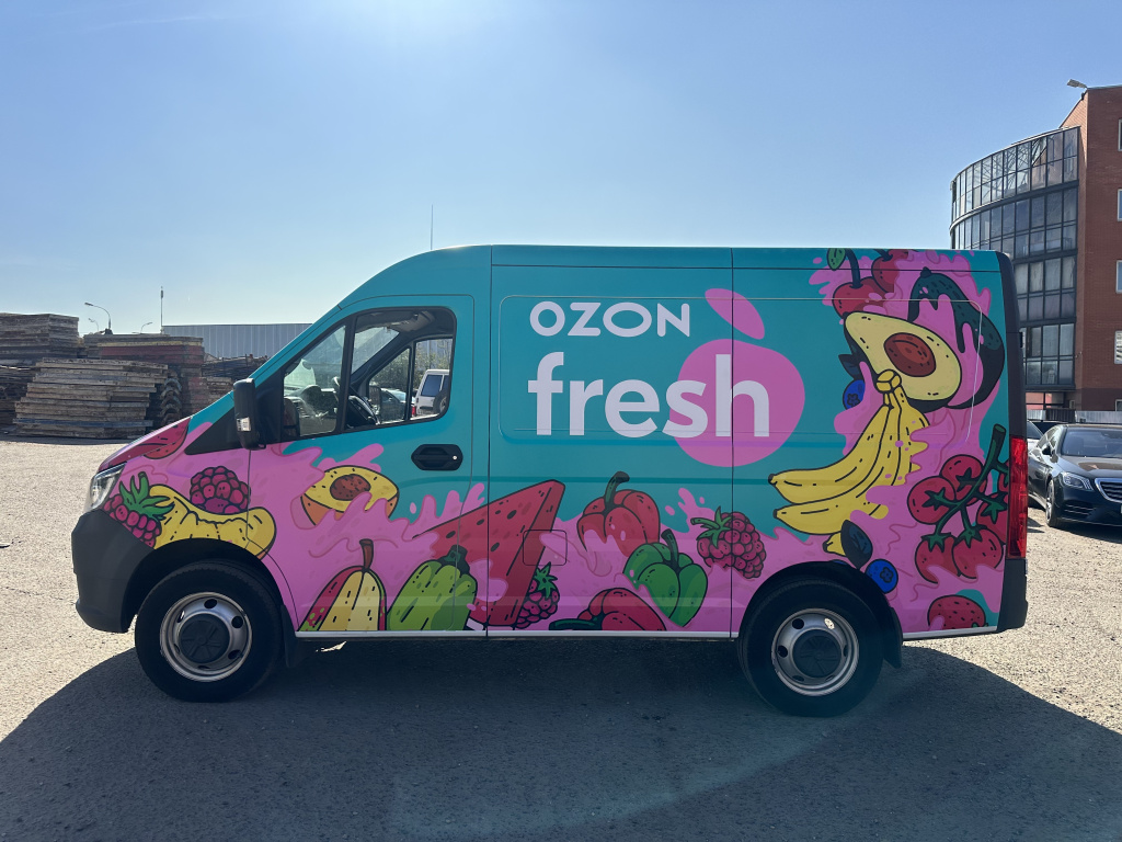Выполнили полную оклейку (включая крышу) более 60 автомобилей «Газель NN» для компании OZON FRESH. Время оклейки одного автомобиля — 8 часов. Проект реализован масштабно и оперативно: транспорт быстро вернулся в эксплуатацию, а компания получила парк мобильных рекламных носителей с единым фирменным оформлением.